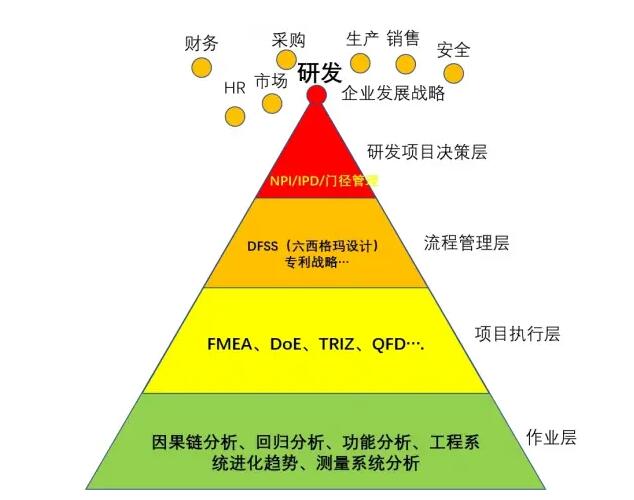 RDMi®的方法论专家组合运用包括但不限于DFSS(六西格玛设计)、TRIZ(发明问题解决理论)、创新降本方法、专利战略、软件创新解决方法、管理流程创新方法、DoE(实验设计)、客户需求挖掘(CTQ下展)、FMEA(潜在失效模式及后果分析)等多种研发方法指导企业解决实际问题,以全面攻克企业创新过程中遇到的不同类型的挑战,其中多种方法为RDMi®独创。