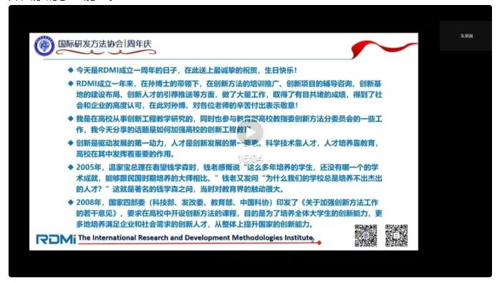 活动伊始,由RDMI主席、TRIZ五级大师孙永伟博士致开场词,祝贺RDMI成立一周年,并对参加线上直播活动的、来自各行各业的研发方法论专家及爱好者们表示热烈的欢迎。