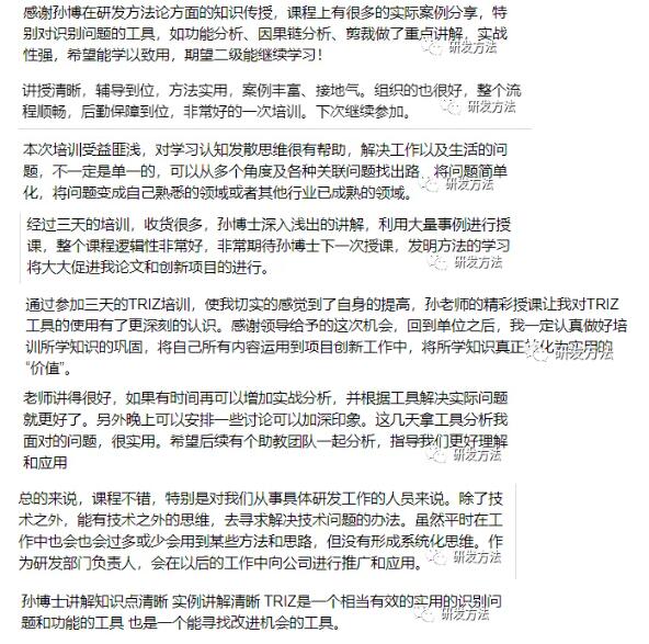 ② 高质量:现场收看顶级五级TRIZ大师的教学现场录制视频,所学内容与三天课程内容完全相同,培训过程中还将安排TRIZ专家答疑;