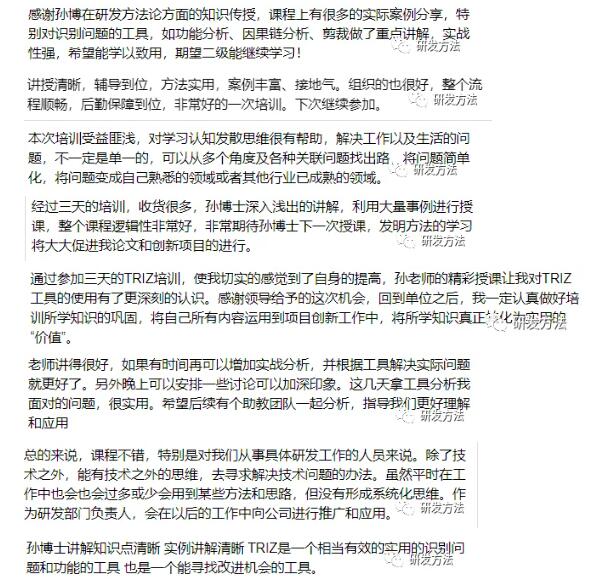 ② 高质量:现场收看顶级五级TRIZ大师的教学现场录制视频,所学内容与三天线下课程内容完全相同,培训过程中还将安排TRIZ专家在线复习、总结、答疑、辅导;