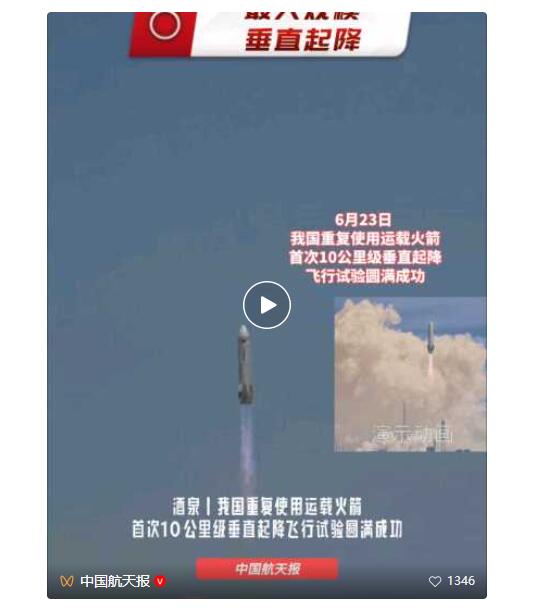 6月23日,中央广播电视总台《新闻联播》播发报道《我国完成重复使用运火箭最大规模垂直起降飞行试验》。