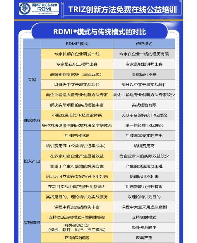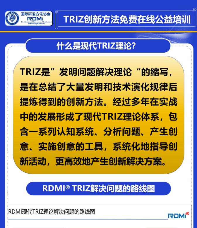 RDMI®(国际研发方法协会,The International Research and Development Methodologies Institute)致力于将全球领先企业在研发项目中起到关键作用的方法论进行研究、提炼、融合,并加以推广,以提升工程师的研发能力,从而提高企业的研发水平,助力企业开发出高质量的产品。RDMI®关注的研发方法论对应于解决企业研发过程中遇到的不同层面的问题,从战略层面到执行层面,从各个方面提高企业的研发水平。RDMI®关注的方法论包括但不限于NPI/IPD、DFSS(六西格玛设计)、专利战略、TRIZ(发明问题解决理论)、FMEA(潜在失效模式及后果分析)、DoE(试验设计)、创新降本等。目前,RDMI®已在广州、武汉、苏州、哈尔滨、成都、上海、香港等地设立了中心。