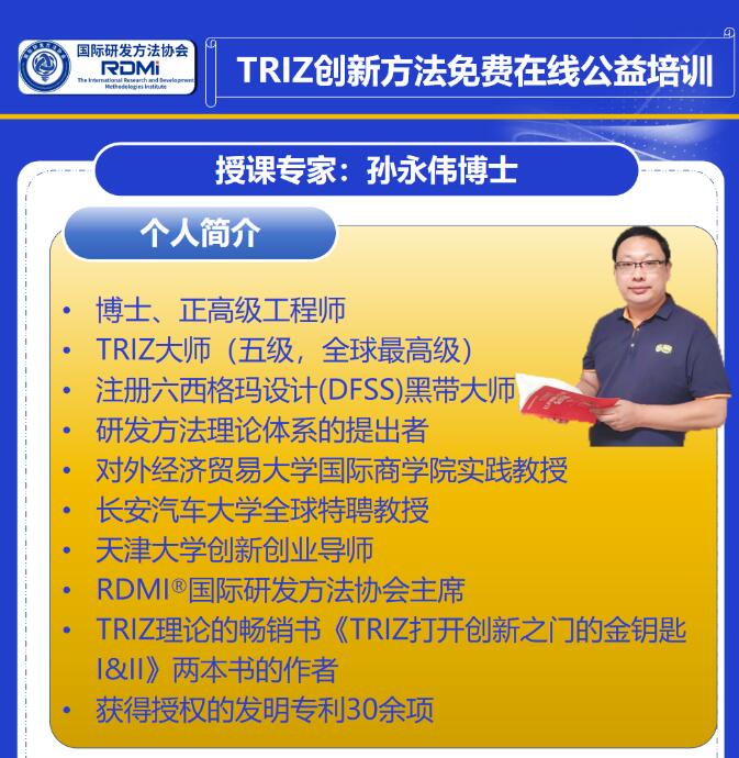 作者简介:孙永伟,博士,注册六西格玛设计(DFSS)黑带大师,TRIZ五级大师,研发方法理论体系的提出者,对外经济贸易大学国际商学院实践教授,天津大学创新创业导师,TRIZ理论的畅销书《TRIZ打开创新之门的金钥匙I》和《TRIZ打开创新之门的金钥匙II》两本书的作者,目前已经获得授权的发明专利30余项。曾任GE(通用电气)全球研发中心工程师、GE能源集团黑带、GE油气集团项目经理等职。孙博士曾获得中国质量技术领域的全国质量技术奖。经他签发不同类别研发方法论认证证书的专家达5000多人,其中多位已经成为企业研发方法论推进负责人。20多年来,他一直在企业和研究机构的研发第一线,具有丰富的企业内部推进六西格玛和TRIZ等先进研发方法论的经验以及运用这些方法论解决实际问题的能力,曾多次受邀到德国、波兰等欧洲国家及韩国、马来西亚、印度等亚洲各国介绍方法论的推进经验。