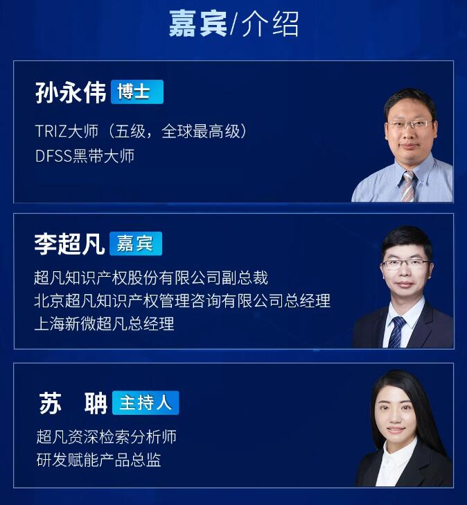 9月29日(周四)晚19:30-21:00,让我们齐聚线上,由经验丰富的专家TRIZ五级大师、DFSS黑带大师孙永伟博士、超凡知识产权副总裁李超凡先生、超凡资深检索分析师/研发赋能产品总监苏聃女士为您一一解答。不见不散!