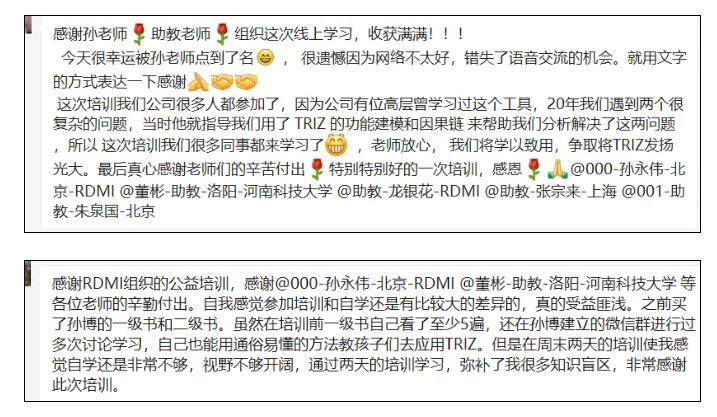 附:2022年3月初RDMI公益TRIZ一级培训部分反馈: