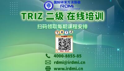 为培养更多高水平、掌握更有效研发方法论的工程师们,提高企业的创新能力,RDMI(国际研发方法协会)已多次成功举办了不同级别的TRIZ培训,为企业培养了大量高素质的研发人员。为使更多研发方法论爱好者们更方便地接受培训,RDMI推出了在线培训方式。此为二级TRIZ培训,面向具备一级TRIZ基础的人员。以下为10月份国庆节期间RDMI TRIZ二级的培训计划,所有培训均安排在非工作时间。(长按上方二维码...